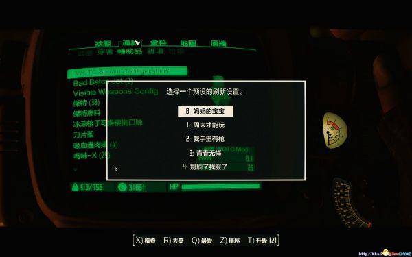 进入游戏后打开Pipboy,在杂项中会找到CSE的设置菜单,打开后可以看到如下设置: