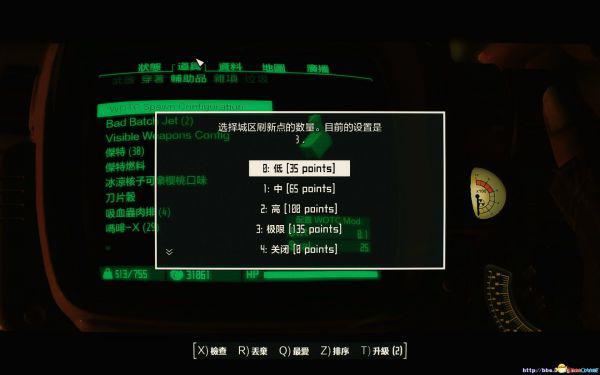 这个菜单控制mod的刷新时间,这些会明显影响到其他刷新设置。原版游戏会168小时后刷新普通的cells,冰在游戏内480小时后“清理”区域。由于这个mod添加了原版没有的刷新点,并且还有许多队伍赈灾某些刷新点载入,它就不能彻底沿用游戏内奸的刷新机制了。比如说如果没有控制刷新时间,每次你接近刷新点时mod都会刷出新的队伍,哪怕你一小时以前清理过这个区域。这意味着区域的敌人永远都杀不光。为了控制这种刷新的浮动本mod使用了它自己的刷新计时器来决定刷新点何时应该重置。这里会有多个设置来管理联邦郊区(子菜单 5.0),城市区域刷新(submenu 5.1)和聚落巡逻(5.2)。设置更短的时间或者将它设置为0会导致对应区域的人口极端密集。另外,由于本mod增加了对游戏资源的需求,原版游戏普通cells的刷新时间被调整到了6小时,标记“清理”的区域则变为24小时。