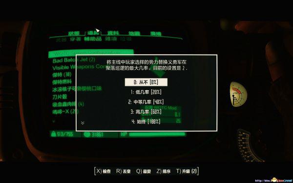 这个菜单控制了本mod中与主线势力有关的内容。义勇军(以及其他主要势力)的巡逻队会出现在玩家聚落周围。激活的巡逻路径会根据玩家在这个聚落的人口和幸福值,最大有7人的巡逻队。具体的巡逻队设置基于(聚落的数量×幸福/100)数字:从3到4的值会解锁一个巡逻队,5-6为2个,7-9是3队,9-10是4队,11-12(5个),13-15(6个,当数值大于15就激活全部7个巡逻。低于两个巡逻就会让他们一直在聚落外绕圈,类似保安,其他5个则会从聚落出发,到更远的地方,扩展可控制的区域。高数值的巡逻会同时有更多人,最多达到8-9人。大部分巡逻队都是义勇军,不过也可以是其他主要势力,一旦玩家成为他们的一员(兄弟会/铁路/和成年人)。你同时也可以设置一个几率,来决定非义勇军的势力负责巡逻(子菜单3.1)。增加控制的聚落就会增加义勇军在联邦各地的出现几率,这个几率的最大数值可以在自带但3.0里设置。这个几率将让所有在联邦的郊区的刷新点,结合成功的RNG掷点,就能把敌人的队伍替换成义勇军的队伍。其他重要的派系设置是为波士顿市区以及剑桥的主线势力设置最小(子菜单3.2)和最大(子菜单3.3)出现几率。当RNG投掷出的点大于这些几率,敌人在城里的刷新都会被主线势力派系取代。至于刷新其他支线势力的几率则根据当前的派系状态。比如,兄弟会巡逻队只在机场附近频繁的巡逻,义勇军会有跟着聚落的增加而增加,而铁路的刷新几率则根据固定的数字组合以及铁路剧情的推进(兄弟会/学院的灭亡,玩家的队友)。和本mod的其他刷新一样,主线势力也会刷新巡逻。