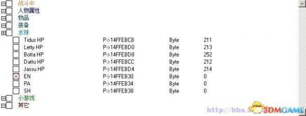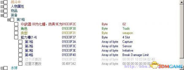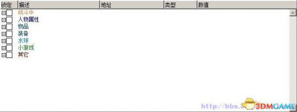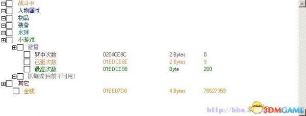 说明都写在CT中了,基本是全中文的,数值那里不能用中文用了会用乱码,自行到我发的那个“完全攻略书”的贴子里找对比去,不过能用下拉菜单的我全改成下拉菜单了,在CE中有"-"的地方说明有子选项,点一下"-"就出现了