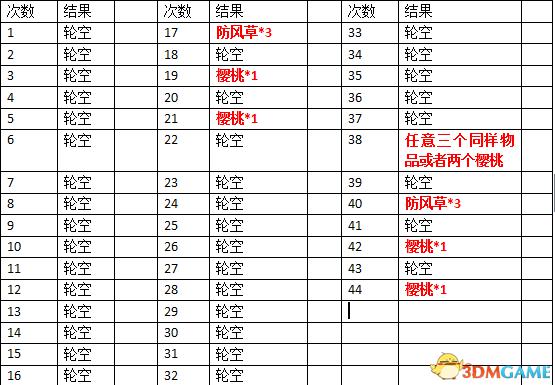 3.另外可能有人会在三个防风草轮空一个樱桃,轮空后也就是第23次出现一个樱桃,这个是会变动的所以没有记录。