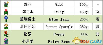 蜂箱——3级Farming可以合成,木头(Wood)×50+煤块(Coal)×8+铁锭(Iron Bar)×1+枫蜜(Maple Syrup)×1,种什么花就不多说了,给个表大家自己看。第四列是对应花蜜价格,加粗的是推荐类型: