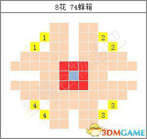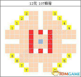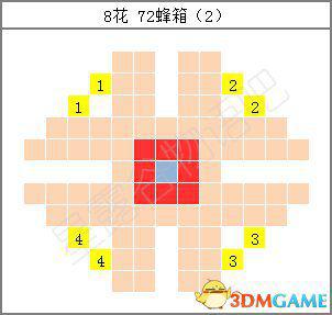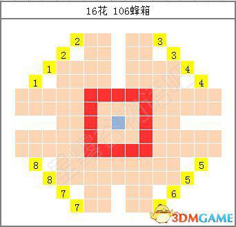 接下来当然是铱洒水器(Iridium Sprinkler)对应的16朵花了。所谓的16朵,就是24格洒水范围的边界。这时不踩花的方式就会牺牲掉中间的8个位置,因此就不介绍了。先说说比较常用的106蜂箱方法: