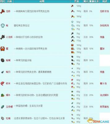某些鱼类只能用蟹笼抓.所有这些抓住的生物可以用于献祭中的蟹笼包.蟹还会掉落自Rock Crabs(15%) 和 Lava Crabs (25%).蛤、 贻贝、 牡蛎还可以在沙滩上觅食找到.