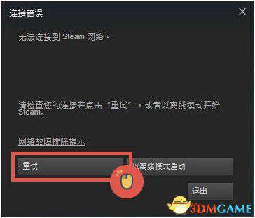 2.提示"连接错误"无法连接到steam网络该错误通常是由于网络问题造成的,请点击"重试"多试几次即可。
