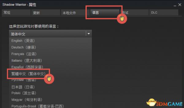 3.如何将游戏语言设置成"繁体中文"请先确定您购买的游戏版本是否含有"繁体中文"如果含有,请在"库"中找到游戏,点击右键"属性",在"语言"一栏中选择"繁体中文"即可。
