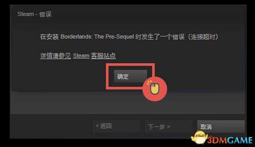 1.安装游戏时提示"连接超时"请点击"确定",之后会出现对话框点击"取消安装",重新运行"setup"即可。该错误通常是由于STEAM服务器访问缓慢造成的,请多试几次即可。