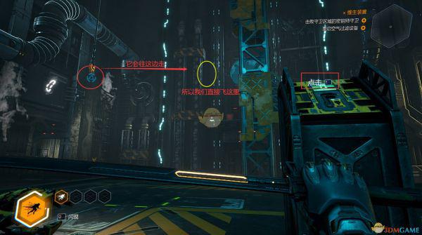 这波啊,这波有两种思路,一种是老老实实按开发者思路先到右边操作台,然后如图二所示在按下操作后直接往黄圈位置冲,然后甩出你们那根又细又长的东西(误)拉过去,就能捡到破晓秋霜了