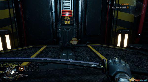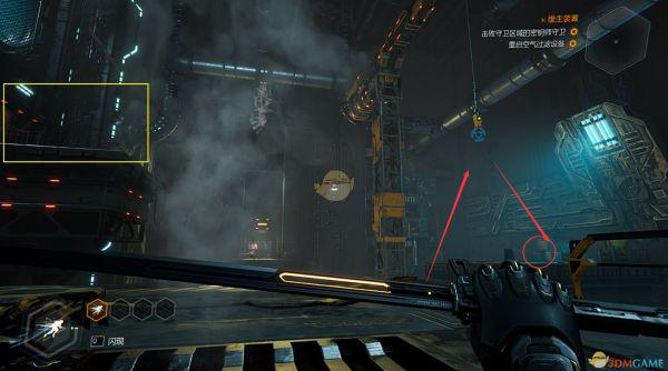 流程:大概在「关卡中期」的位置,在一个经典(经典:指本作中经常出现)的“回”字形位置杀掉两个机枪手和两个近战植入体之后,就会来到图一所示的位置。左边黄框内,也就是上面的平台就有我们的破晓秋霜。