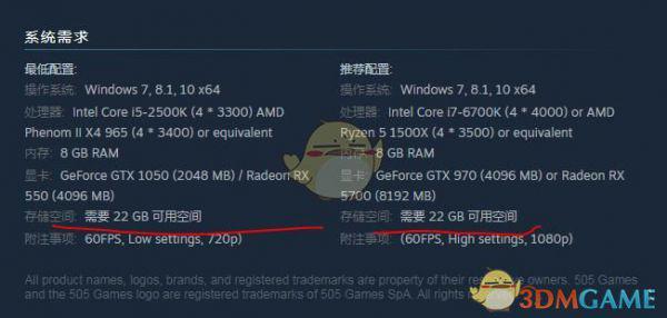 steam官方给出的配置要求里要求的是 22GB 存储空间。