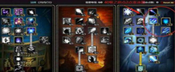 法师并不是从一出生就可以A怪,而是需要天赋强化暴风雪的支持(不要相信14级奥爆A怪,跑尸耽误的时间还不如做任务),所以想要正常A怪至少需要点满上图红色圆圈中的天赋,也就是22级,而法师需要在40级才会有冰盾,因此在低级别的时候第一层可以选择2点寒冰箭,到了后期再洗,如果不想洗天赋就按照上面的天赋点就可以。
