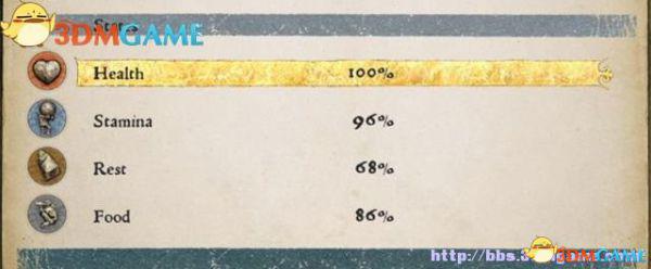 休息度(Rest):当你长时间得不到休息就会感觉乏累,无精打采,眼皮闭合,严重影响着你的冒险旅行,所以在乏累时还是找张床铺睡上一觉为好。