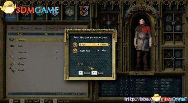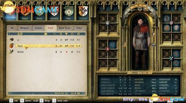 物品菜单里显示着当前主角身上所有的装备和物品,还有你的负重量/最大负重,以及拥有的金钱数量。