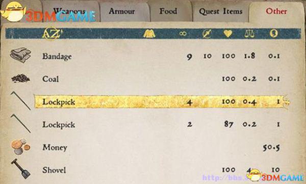 这些物品可自动分类:武器、服装、食物、任务物品和其它。