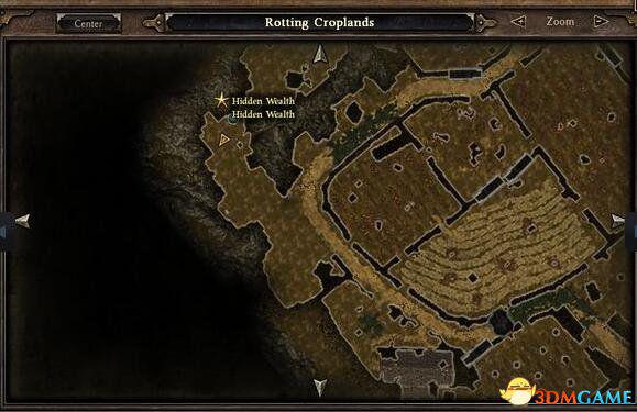 藏宝在田地左上角。需要炸药炸开,不过需要先接藏宝任务才能炸:
