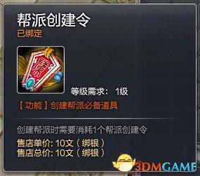 创建帮派流程 1.玩家首先需要准备帮派创建令及5锭银子。帮派创建令可在随身商城中购买获得。