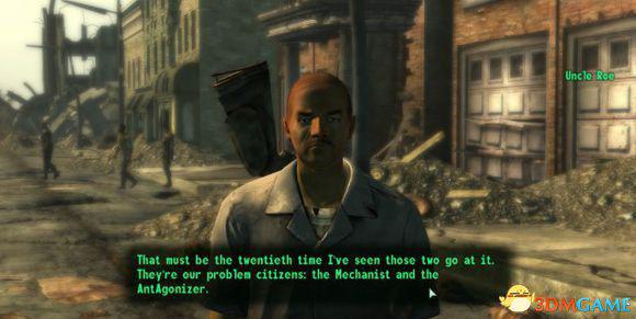 在辐射3里面玩家可以在第一次到坎特伯雷格村的时候遇到机械侠,和他的死对头蚂蚁女。