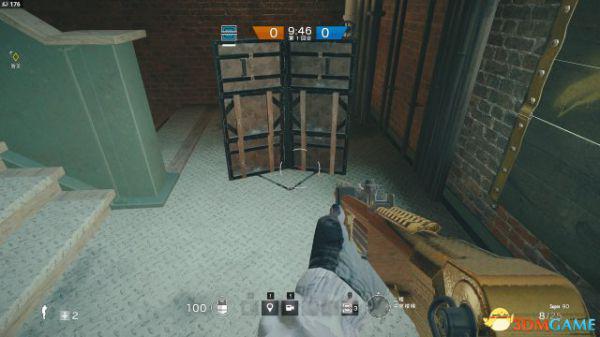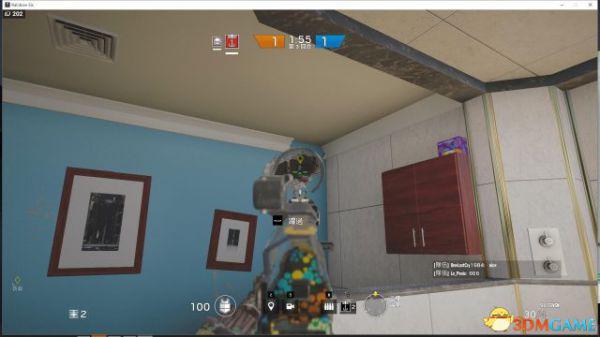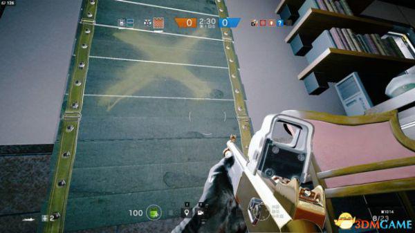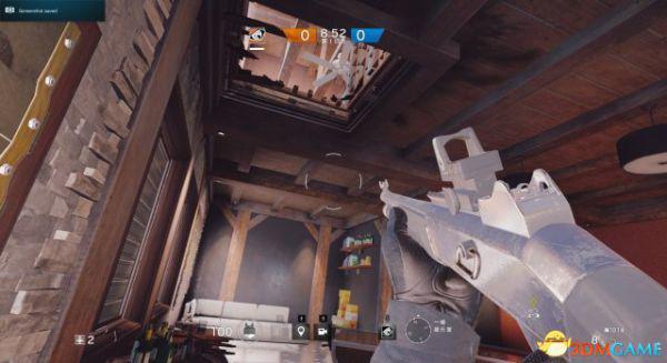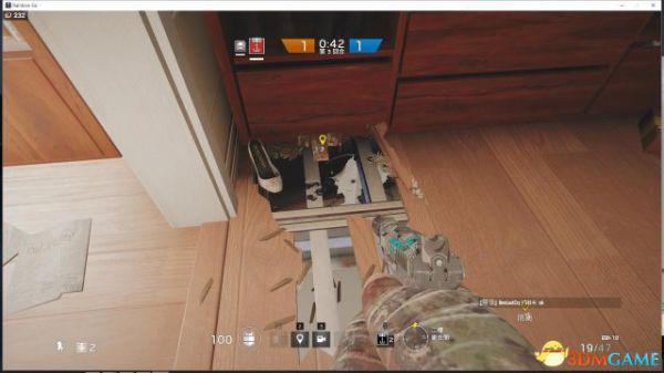 46、有些地图的防守点 以木屋二楼书房为例,如图 有些防守点2l有一处能破坏看到1L的,你可以把他用喷子或者C4开一个洞 然后可以一边防守 一边通过这里看到下方 也可以作为万一2l防守不住了 可以从这里跳下逃走;再来又或者可以跳下绕别人背后偷袭等等