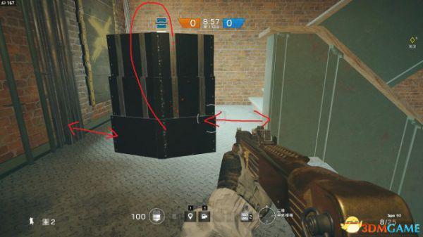 以俱乐部卧室楼梯拐角这一处为例子 可以设置一个机动盾 注意如图 盾牌左右两边的空位 要保证不能穿过去