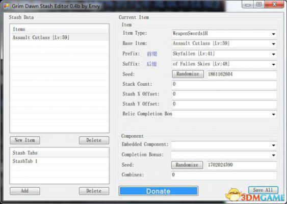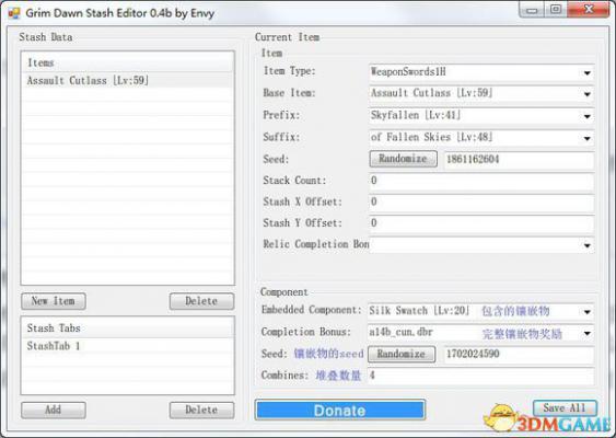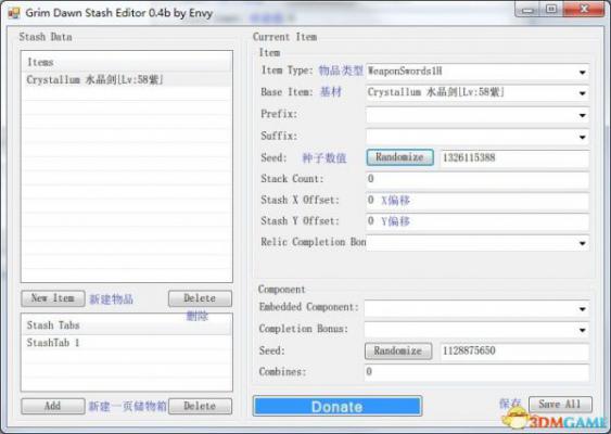 以添加紫装“水晶剑”为例,点New Item新建一个物品,Item Type物品类型选择单手剑,基材找到水晶剑,点击保存,程序目录下会生成transfer.gst文件,请先确认游戏中未打开储物箱,然后拷贝transfer.gst至存档目录下覆盖,切换游戏打开共享仓库即可取出装备。