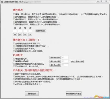 2、加入全武将四围修改,免除大家找其他属性修改器的麻烦;四围修改说明请详见自带的”属性修改说明“;