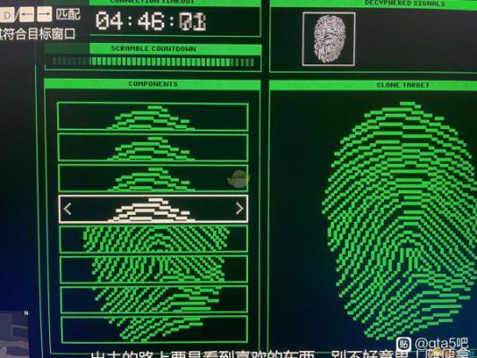 《侠盗猎车5/GTA5》中佩里科抢劫的指纹锁是非常复杂的,就是把每一排(试难度而定。有可能只用前三个也有可能八个都要)都调成指尖那一节的指纹(如下图),然后第二排右切一下,第三排右切两下,第四排右切三下以此类推。直到拼指纹完成。