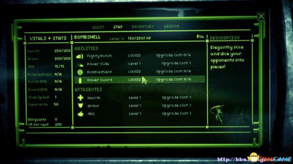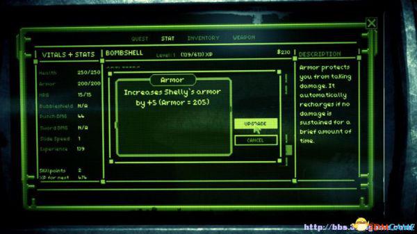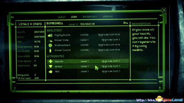 属性栏:查看夏莉的属性数据(包括生命值、护甲值、能量值、泡泡护盾值、拳击伤害值、剑伤害值、滑铲速度、经验值、技能点数、升至下一级所需经验值)。技能,查看夏莉的技能,可以对技能升级以及解锁。