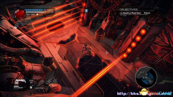 step4.来到一个四周布满能量石的房间当中,以机关枪快速击中所有的能量石,才能够令到中部的激光消失,然后使用控制台。