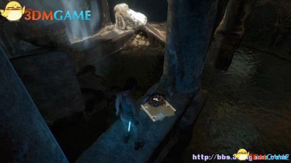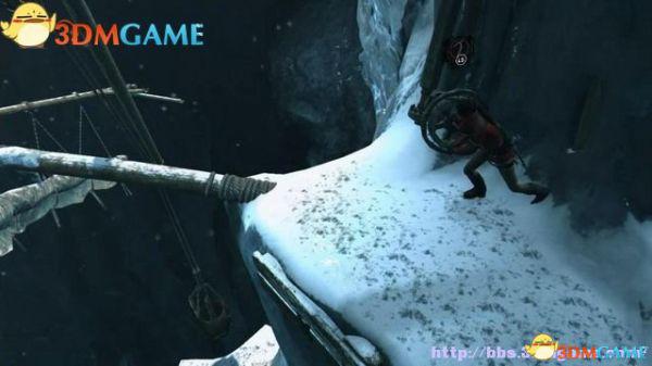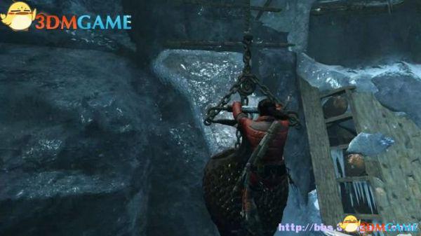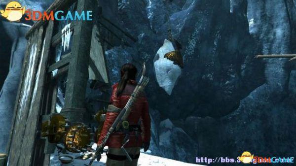 右侧的墙壁上有可攀爬的地方,不过得先砸开上面的浮冰。首先扳动如图的机关,右边的绳索落下一只沉重的金属瓶子。