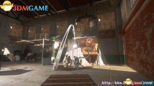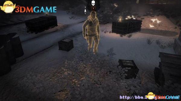 回到地面,绕到右边的箱子后面拾取提灯,将它扔在那个蒙白布的设备上,将那三名聚在一堆的家伙烧死。