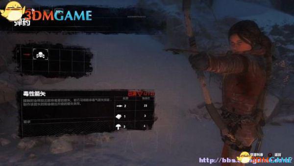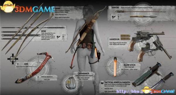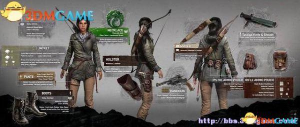 武器:在此可用使用素材强化武器,包括4把武器(弓、手枪、霰弹枪、冲锋枪)和攀爬斧,此外还可以为劳拉换装。
