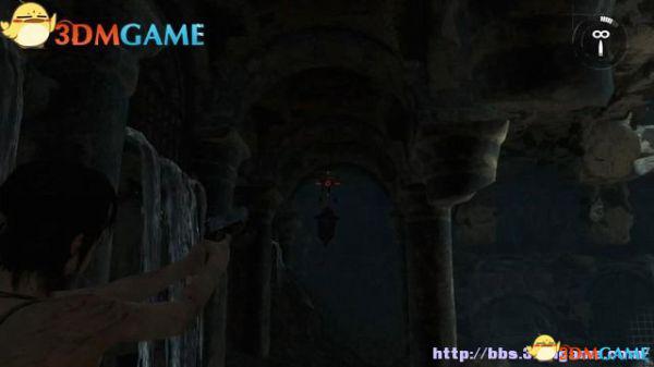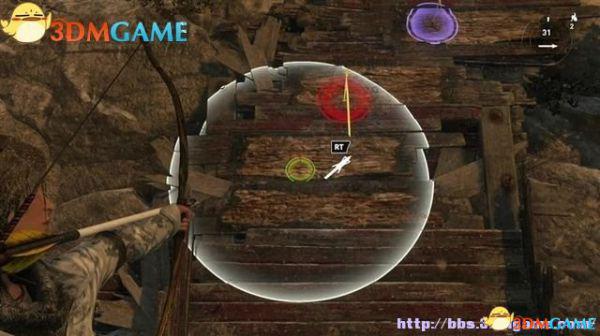 ▲即将射出的这支箭可以与上面箭矢共存,并且劳拉可以在两支箭之间移动,而下面红色圆圈所示的箭矢将消失