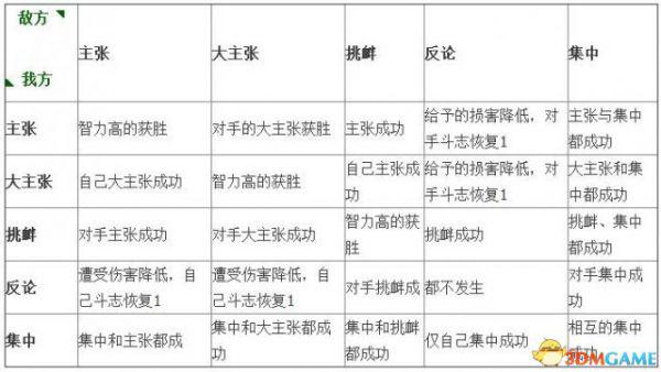 舌战的胜负和单挑一样,也是进行5个会和,残存气力比对手多的话就可以获胜。拥有特技[口才]的武将,可以以才气恢复的状态开始舌战。