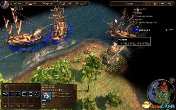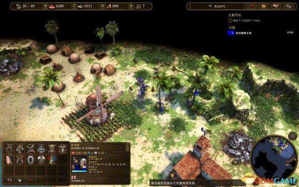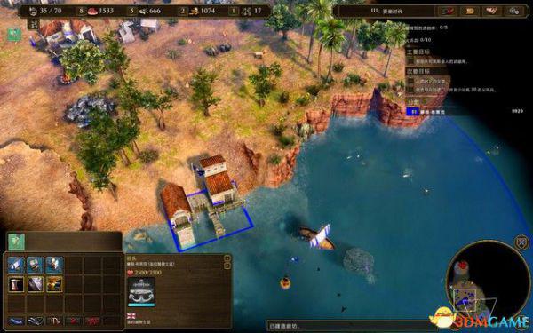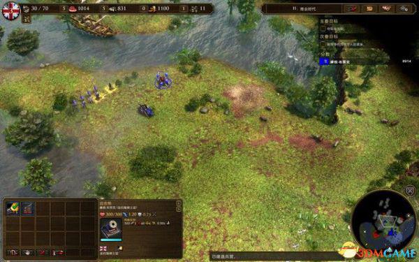 首先建造城镇中心,爆农民,先砍树搜集木材,同时让战舰沿着海岸南下,