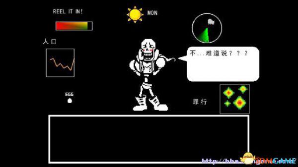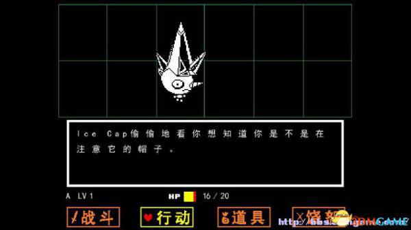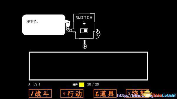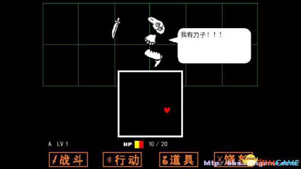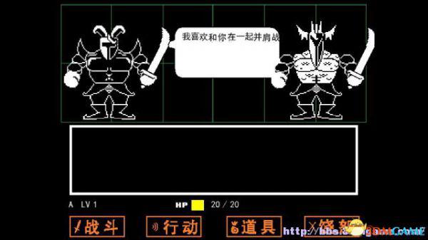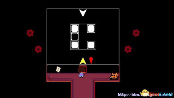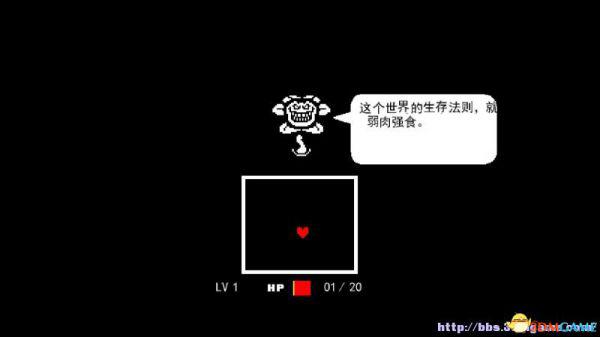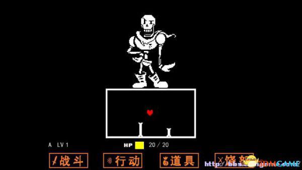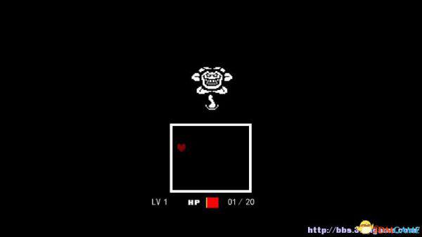 战斗方框:如果敌人选择攻击你(不论你是否选择主动攻击),在屏幕下方会出现一个方框,玩家操控这个心形对方框的图案进行躲避,一旦被触碰就会受到伤害,某类特殊图案即便是触碰了也不会受到伤害(如骷髅的蓝光)。