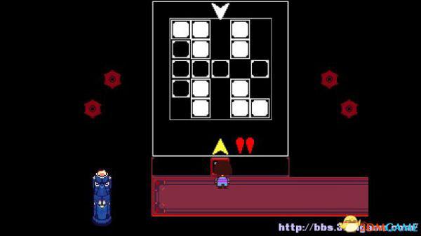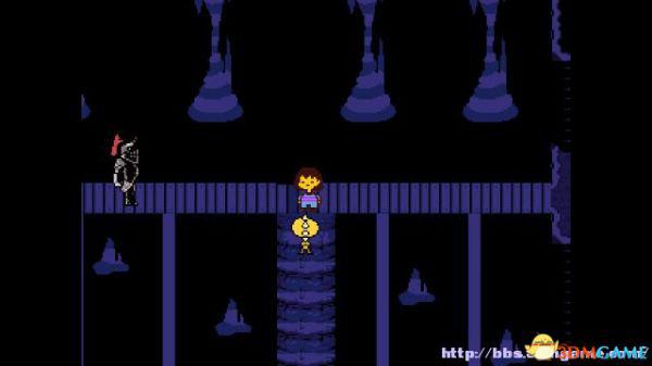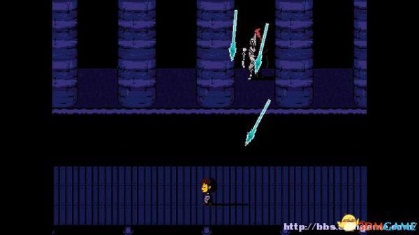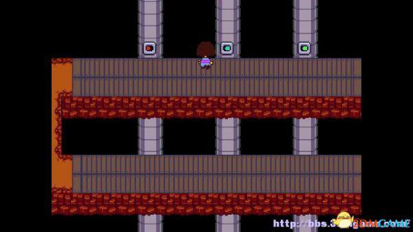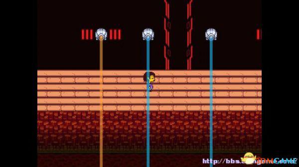 step24.北面的机关,alphys博士会关掉它,接下来的道路中激光机关会时不时启动,你要根据橙色或蓝色,选择行走或停滞来躲避激光。