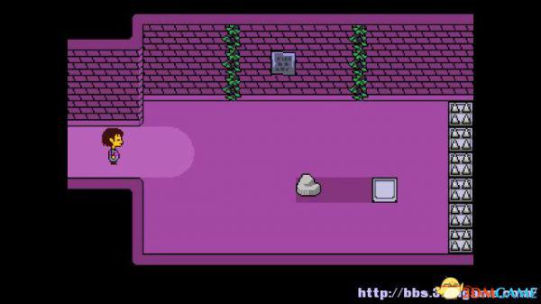 随后进入到东西向并且有两条小溪长廊上,Toriel需要你去拉下墙上有标记的杆子,一共需要拉下两个,那么东面的尖刺陷阱就会被移除。