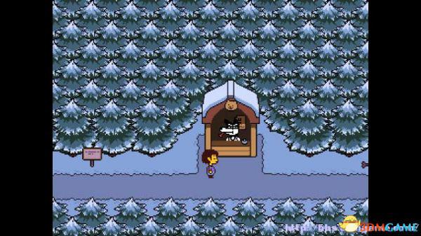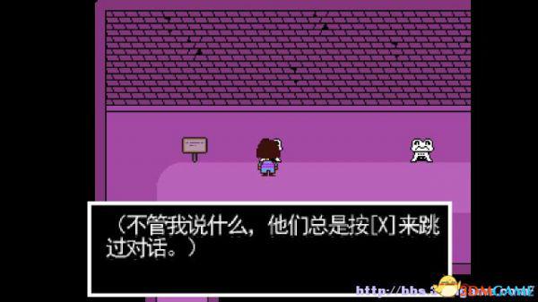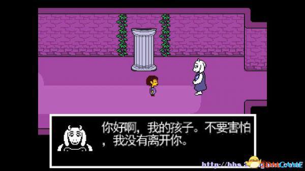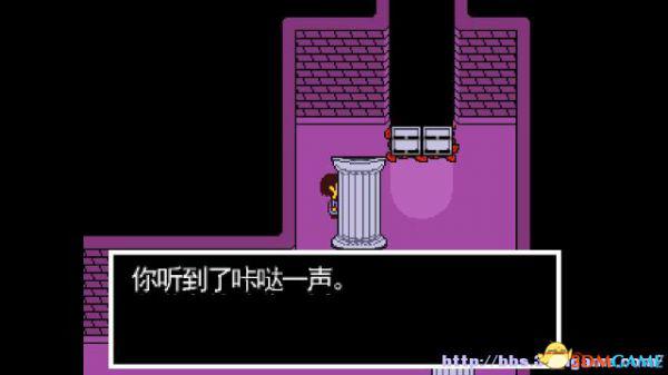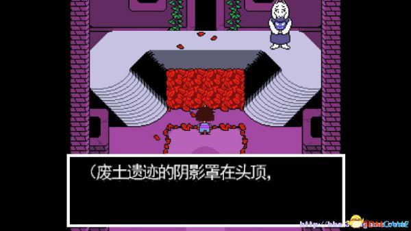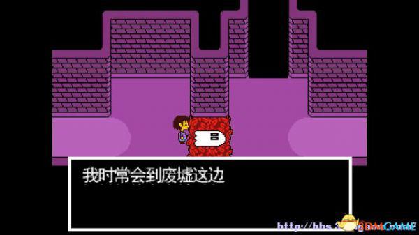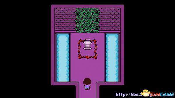 在这个走廊内游走会遇到青蛙froggit,以赞美就可以将其击败;北面的房间内放着一颗糖,你可以选择拿走或者不拿走。