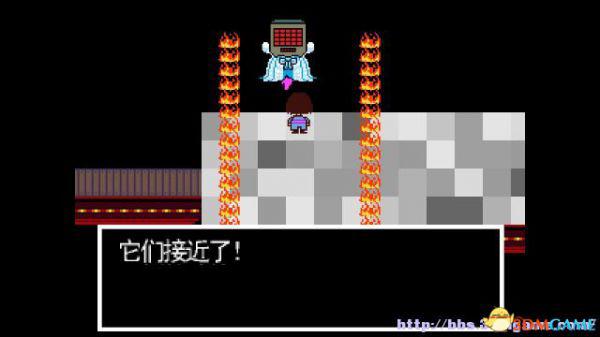step19.这时候你被迫走上了那个脸papyrus都记不清步骤的色板上,你是肯定走不出去的,所以站在原地等待两边的火墙靠近即可,alphys博士会在紧急情况下将它们关停。