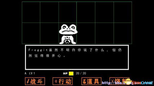 step4.去到北面的藤蔓房间内会遇到青蛙froggit,选择“行动——赞美”,虽然青蛙不知道你在说什么,但他变得很开心,他就会逃离战斗。