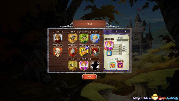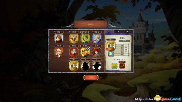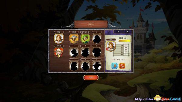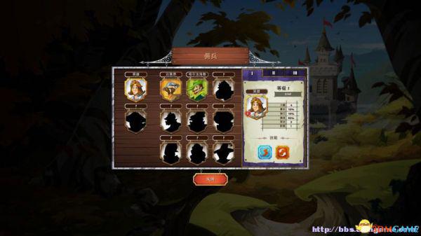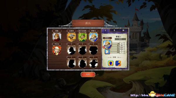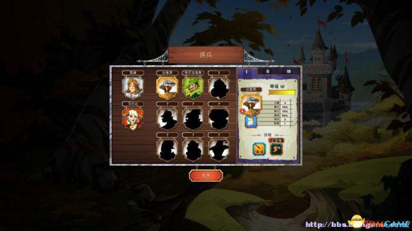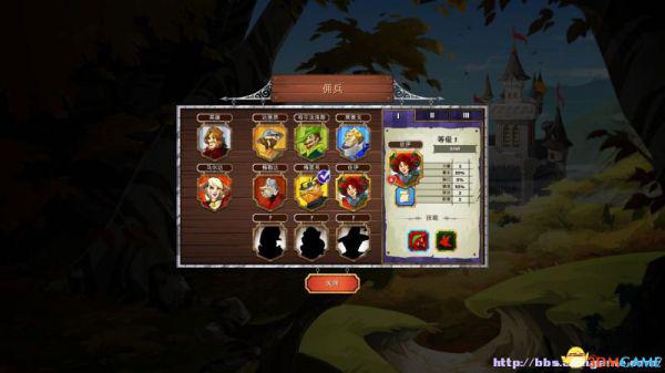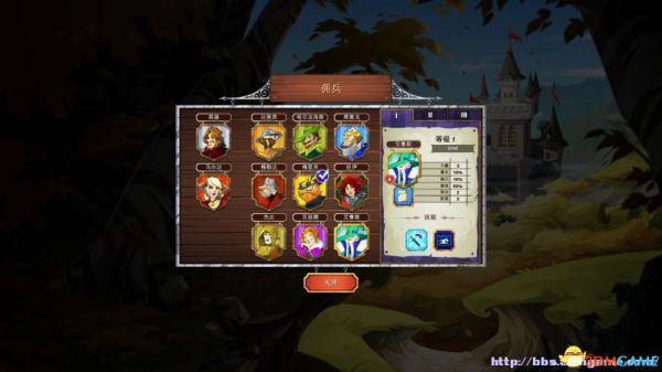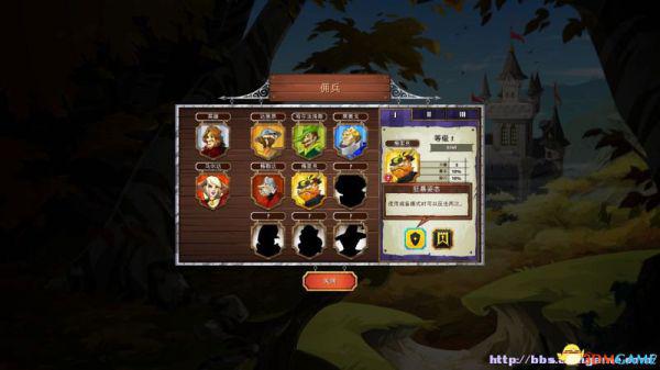 雇佣兵:在这里可以查看已经解锁的雇佣兵(属性、阶段)以及雇佣他们。