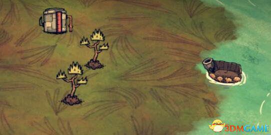 树长大之后,开启灭火器,上船用加农炮轰那40棵树,灭火器灭火,得到大量的木头、怪物肉、鸡蛋等。