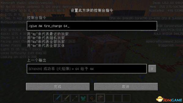 其实也就是我们获取命令方块的指令,我们将玩家名后面的物品名换成自己想要的东西就可以了。这里以火焰弹为例:/give AW fire_charge 64 就是给我64个烈焰弹啦。至于物品的名称,我们可以在我的世界wiki当中找到它们。将这个代码放在命令方块当中: