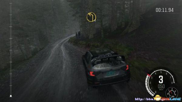 虽说落差小而且是轻砂砾路面,但基本是在森林内比赛,所以起步车速只能维持在40km/h,起步后就是一个右转3号弯,基本速度只能维持在40至60km/h,进入接下来的右转3号弯,越过土堆后接着是一个S型的4号弯。紧接着的4号弯可以提到80km/h,但不能切入过弯,并且出弯时再降到60km/h。