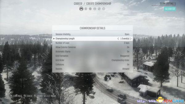 设置赛事:玩家可以自行修改拉力赛、拉力穿越赛和爬山赛的比赛设置,然后进行自定义的单场赛事。