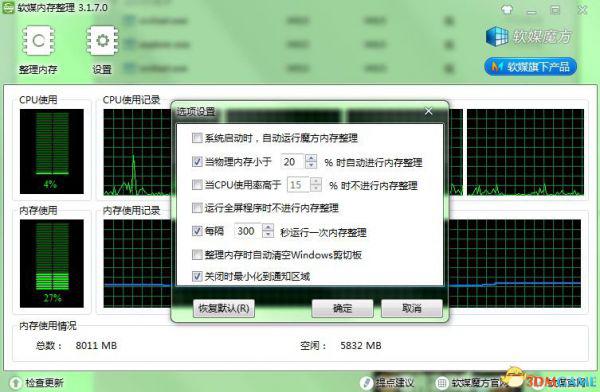 (软媒的内存整理,非常绿色,单独运行)类似软件都行,如上图已选择占用超过80%清理一下,或5分钟清理一下。都是自动快速清理,清理一下就占用50%了。