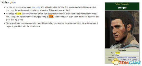 当你用控制台让他可被杀死时,司特吉会掉下合成人元件,这是在任何时刻也会发生,游戏中没有任何提示他是合成人,也许就连他本人也不知道自己是合成人。