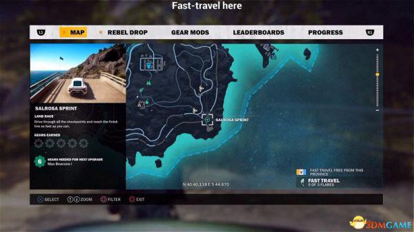 首先,快速传送到“BAIA省”,解放与否不用管,F1赛车都是出现在同样的位置。打开地图,锁定“Salrosa Sprint Race”,下图中我们已经标记出来了,一个“方向盘”一样的高亮的标记。