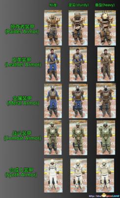游戏里成套的盔甲造型有5种,分别是掠夺者、皮、金属、战斗以及合成人。但实际上每个装甲部件的白板根据前缀是分为标准、坚实(sturdy)以及重型(heavy)的区别。