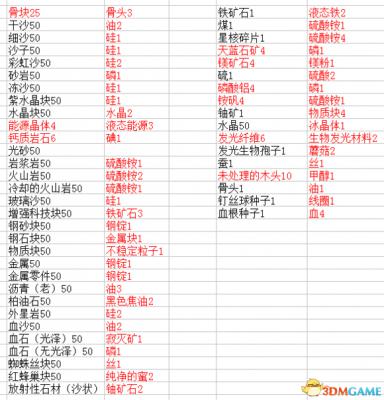看攻略打就少了很多乐趣,于是做了一个提取物的表格总汇,算不上攻略,对于新手来说也是一个参考。玩的2.16版带汉化.以下是一部分材料的提取物。